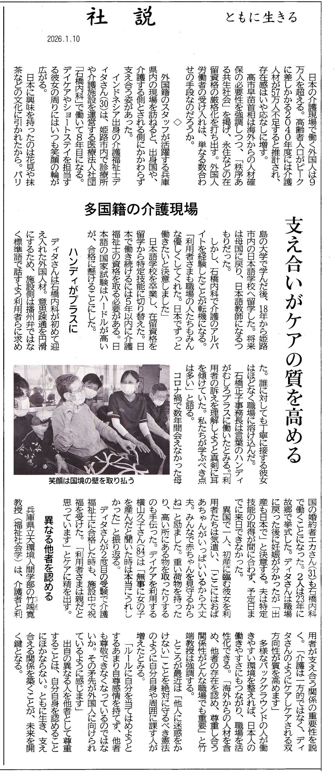 先日、インドネシア出身の介護福祉士、ディタさんの取り組みが、2026年1月10日(土)神戸新聞 朝刊に大きく掲載されました!