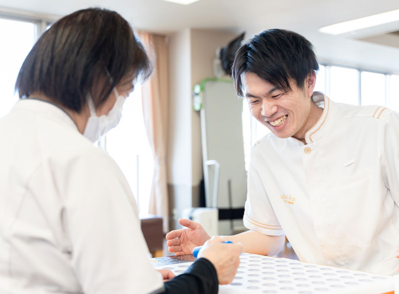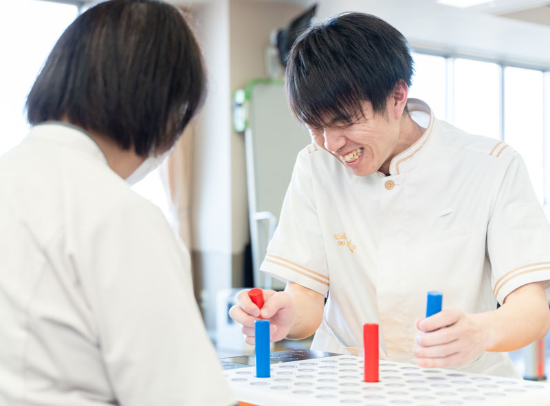 医療との連携が行え、看護師・リハビリスタッフ・作業療法士・言語聴覚士が在籍しており、密に連携して、個別のリハビリを受けていただくことができます。